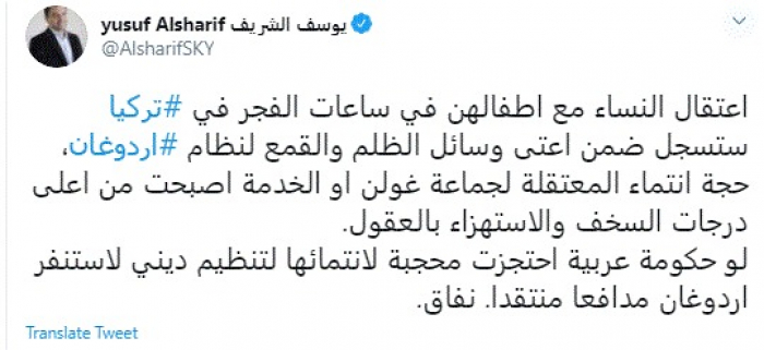 وقال في تغريدة عبر "تويتر" رصدها "المشهد العربي": "اعتقال النساء مع اطفالهن في ساعات الفجر في تركيا ستسجل ضمن أعتى وسائل الظلم والقمع لنظام أردوغان، حجة انتماء المعتقلة لجماعة غولن أو الخدمة أصبحت من أعلى درجات السخف والاستهزاء بالعقول".