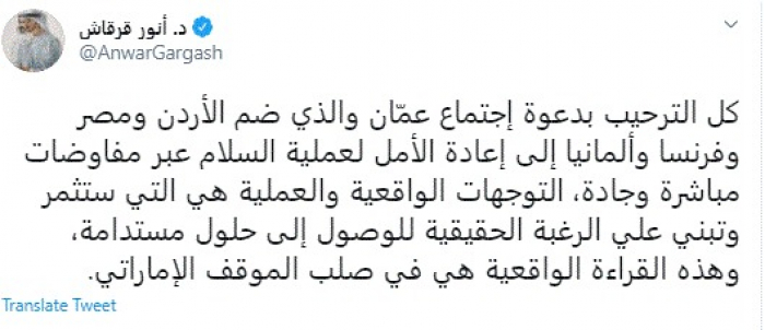 وقال في تغريدة عبر "تويتر" رصدها "المشهد العربي": "كل الترحيب بدعوة إجتماع عمّان والذي ضم الأردن ومصر وفرنسا وألمانيا إلى إعادة الأمل لعملية السلام عبر مفاوضات مباشرة وجادة، التوجهات الواقعية والعملية هي التي ستثمر وتبني علي الرغبة الحقيقية للوصول إلى حلول مستدامة، وهذه القراءة الواقعية هي في صلب الموقف الإماراتي".