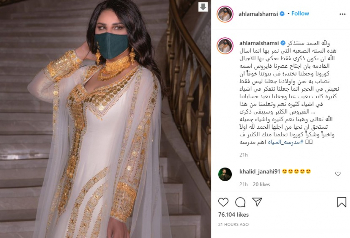 وكتبت: "ولله الحمد سنتذكر هذه السنة الصعبة التي نمر بها إنما أسأل الله أن تكون ذكرى فقط نحكي بها للأجيال القادمة بأن اجتاح عصرنا فيروس اسمه كورونا، وجعلنا نختبئ في بيوتنا خوفاً من أن نصاب به نحن وأولادنا".