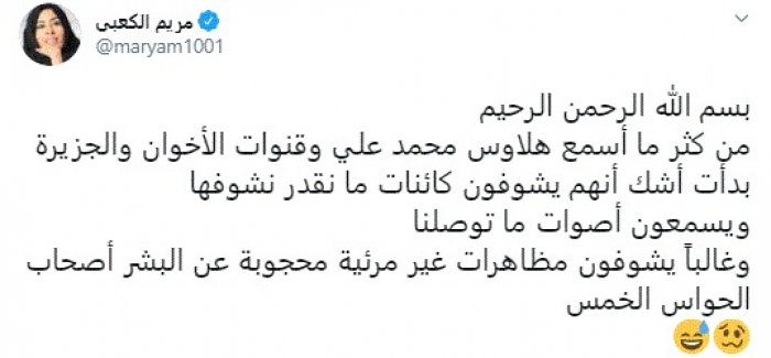 وقالت في تغريدة عبر "تويتر" رصدها "المشهد العربي": "بسم الله الرحمن الرحيم من كثر ما اسمع هلاوس محمد علي وقنوات الإخوان والجزيرة بدأت أشك أنهم يشوفون كائنات ما نقدر نشوفها ويسمعون أصوات ما توصلنا وغالباً يشوفون مظاهرات غير مرئية محجوبة عن البشر أصحاب الحواس الخمس".