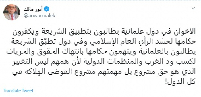 وجه الإعلامي والمراقب الدولي الجزائري الدكتور أنور مالك، اليوم، انتقادًا لاذعًا لجماعة الإخوان، مؤكدًا أنها تريد تنفيذ مشروع الفوضى الهلاكة في كل الدول.