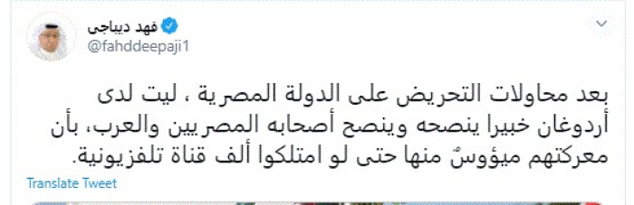 وقال في تغريدة عبر "تويتر" رصدها "المشهد العربي": "بعد محاولات التحريض على الدولة المصرية ، ليت لدى أردوغان خبيرا ينصحه وينصح أصحابه المصريين والعرب، بأن معركتهم ميؤوسٌ منها حتى لو امتلكوا ألف قناة تلفزيونية".
