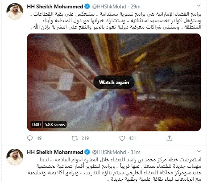 وأضاف: "برامج الفضاء الإماراتية هي برامج تنموية مستدامة ستنعكس على بقية القطاعات وستؤهل كوادر تخصصية استثنائية وستشارك خبراتها مع دول المنطقة وأبناء المنطقة وستبني شراكات معرفية دولية تعود بالخير والنفع على البشرية بإذن الله".