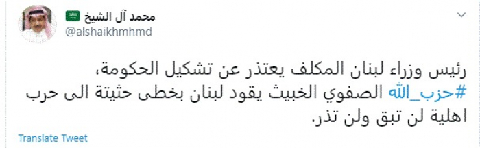 وقال في تغريدة عبر "تويتر" رصدها "المشهد العربي": "رئيس وزراء لبنان المكلف يعتذر عن تشكيل الحكومة، حزب الله الصفوي الخبيث يقود لبنان بخطى حثيتة إلى حرب أهلية لن تبق ولن تذر".