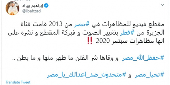 وقال في تغريدة عبر "تويتر" رصدها "المشهد العربي": "مقطع فيديو للمظاهرات في مصر من 2013 قامت قناة الجزيرة من قطر بتغيير الصوت وفبركة المقطع ونشره على أنها مظاهرات سبتمر 2020.. حفظ الله مصر ووقاها شر الفتن ما ظهر منها وما بطن.. تحيا مصر ومتحدون ضد أعدائك يا مصر".