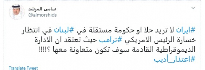 وقال في تغريدة عبر "تويتر" رصدها "المشهد العربي": "إيران لا تريد حلا أو حكومة مستقلة في لبنان في انتظار خسارة الرئيس الأمريكي ترامب حيث تعتقد أن الإدارة الديموقراطية القادمة سوف تكون متعاونة معها ؟ اعتذار أديب".