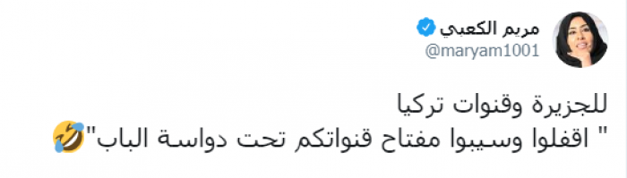 وكتبت الكعبي عبر تغريدة لها على "تويتر" رصدها " المشهد العربي": "للجزيرة وقنوات تركيا، اقفلوا وسيبوا مفتاح قنواتكم تحت دواسة الباب".