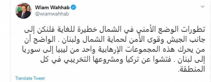 وقال في تغريدة عبر "تويتر" رصدها "المشهد العربي": "تطورات الوضع الأمني في الشمال خطيرة للغاية فلنكن إلى جانب الجيش وقوى الأمن لحماية الشمال ولبنان . الواضح أن من يحرك هذه المجموعات الإرهابية واحد من ليبيا إلى سوريا إلى لبنان . فتشوا عن تركيا ومشروعها التخريبي في كل المنطقة".