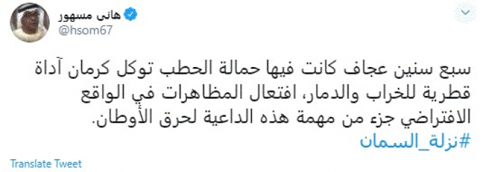 وقال في تغريدة عبر "تويتر" رصدها "المشهد العربي": "سبع سنين عجاف كانت فيها حمالة الحطب توكل كرمان آداة قطرية للخراب والدمار، افتعال المظاهرات في الواقع الافتراضي جزء من مهمة هذه الداعية لحرق الأوطان".
