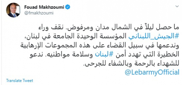 وقال في تغريدة عبر "تويتر" رصدها "المشهد العربي": "ما حصل ليلاً في الشمال مدان ومرفوض. نقف وراء الجيش اللبناني المؤسسة الوحيدة الجامعة في لبنان، وندعمها في سبيل القضاء على هذه المجموعات الإرهابية الخطيرة التي تهدد أمن لبنان وسلامة مواطنيه. ندعو للشهداء بالرحمة وبالشفاء للجرحى".