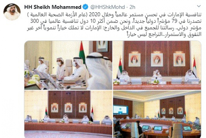 وأضاف: "تنافسية الإمارات في تحسن مستمر عالمياً وخلال 2020 (عام الأزمة الصحية العالمية ) تصدرنا في 79 مؤشراً دولياً جديداً، ونحن ضمن أكثر 10 دول تنافسية عالميا في 300 مؤشر دولي. رسالتنا للجميع في الداخل والخارج: الإمارات لا تملك خياراً تنموياً آخر غير التفوق والاستمرار..التراجع ليس خياراً".