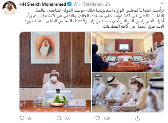 وقال في تغريدات عبر "تويتر" رصدها "المشهد العربي": "ترأست اجتماعاً لمجلس الوزراء استعرضنا خلاله موقف الدولة التنافسي عالمياً .. الامارات الأولى في 121 مؤشر على مستوى العالم.. والأولى في 479 مؤشر عربياً.. أبارك لأخي رئيس الدولة ولأخي محمد بن زايد ولأعضاء المجلس الأعلى .. هذه جهود آلاف فرق العمل في كافة القطاعات".