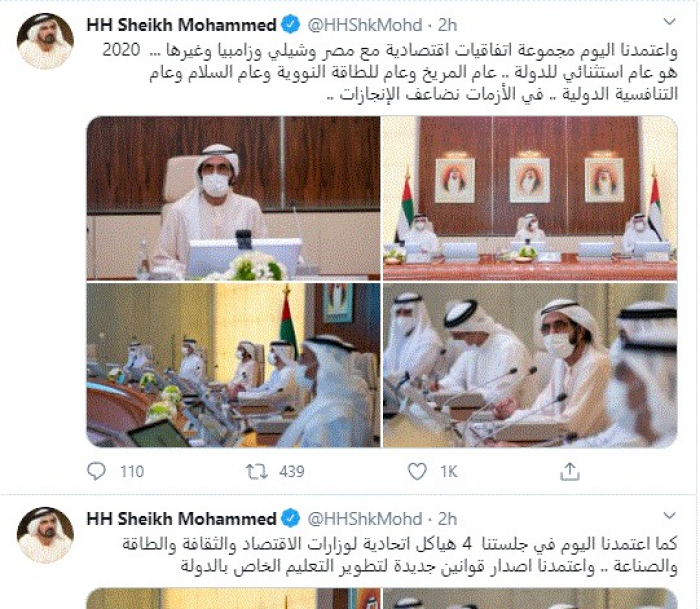 وتابع: "واعتمدنا اليوم مجموعة اتفاقيات اقتصادية مع مصر وشيلي وزامبيا وغيرها ... 2020 هو عام استثنائي للدولة .. عام المريخ وعام للطاقة النووية وعام السلام وعام التنافسية الدولية .. في الأزمات نضاعف الإنجازات".