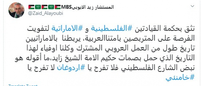 وكتب في تغريدة عبر "تويتر" رصدها "المشهد العربي": "نثق بحكمة القيادتين الفلسطينية والإماراتية لتفويت الفرصة على المتربصين بأمتنا العربية، يربطنا بالإماراتيين تاريخ طويل من العمل العروبي المشترك وكلنا أوفياء لهذا التاريخ الذي حمل بصمات حكيم الأمة الشيخ زايد، ما أقوله هو نبض الشارع الفلسطيني فلا تفرح يا أردوغان لا تفرح يا خامنئي".