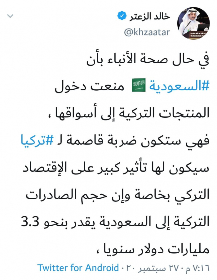 وكتب "الزعتر" تغريدة عبر حسابه الشخصي بتويتر رصدها "المشهد العربي" : "في حال صحة الأنباء بأن السعودية منعت دخول المنتجات التركية إلى أسواقها ، فهي ستكون ضربة قاصمة لـتركيا سيكون لها تأثير كبير على الإقتصاد التركي بخاصة وإن حجم الصادرات التركية إلى السعودية يقدر بنحو 3.3 مليارات دولار سنوياً" .