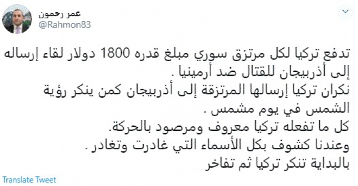 وقال في تغريدة عبر "تويتر" رصدها "المشهد العربي": "تدفع تركيا لكل مرتزق سوري مبلغ قدره 1800 دولار لقاء إرساله إلى أذربيجان للقتال ضد أرمينيا".