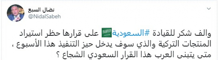 وقال في تغريدة عبر "تويتر" رصدها "المشهد العربي": "وألف شكر للقيادة السعودية على قرارها حظر استيراد المنتجات التركية والذي سوف يدخل حيز التنفيذ هذا الأسبوع، متى يتبنى العرب هذا القرار السعودي الشجاع؟".