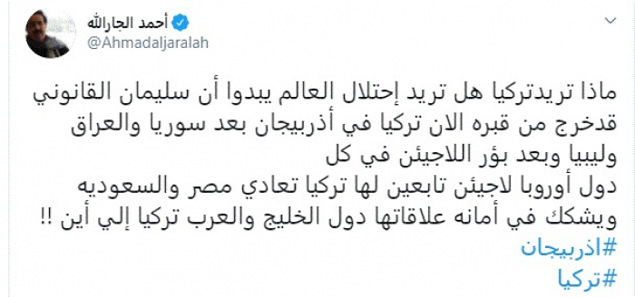وقال في تغريدة عبر "تويتر" رصدها "المشهد العربي": "ماذا تريد تركيا هل تريد احتلال العالم يبدو أن سليمان القانوني قد خرج من قبره الآن تركيا في أذربيجان بعد سوريا والعراق وليبيا وبعد بؤر اللاجيئن في كل دول أوروبا لاجيئن تابعين لها".