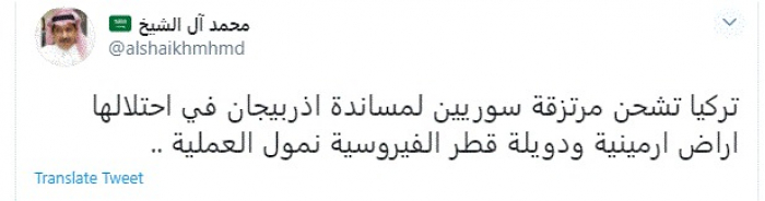 وكتب في تغريدة عبر "تويتر" رصدها "المشهد العربي": "تركيا تشحن مرتزقة سوريين لمساندة أذربيجان في احتلالها أراض أرمينية ودويلة قطر الفيروسية نمول العملية".