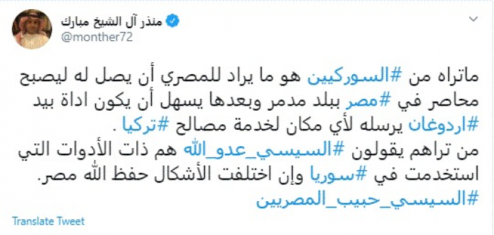 وقال في تغريدة عبر "تويتر" رصدها "المشهد العربي": "ما تراه من السوركيين هو ما يراد للمصري أن يصل له ليصبح محاصر في مصر ببلد مدمر وبعدها يسهل أن يكون أداة بيد أردوغان يرسله لأي مكان لخدمة مصالح تركيا".