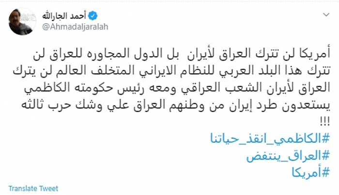 وأضاف: "العالم لن يترك العراق لإيران الشعب العراقي ومعه رئيس حكومته الكاظمي يستعدون طرد إيران من وطنهم العراق علي وشك حرب ثالثة".