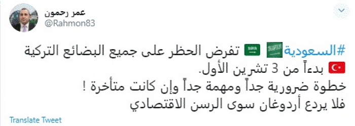 وقال في تغريدة عبر "تويتر" رصدها "المشهد العربي": "السعوديةتفرض الحظر على جميع البضائع التركية بدءاً من 3 تشرين الأول. خطوة ضرورية جداً ومهمة جداً وإن كانت متأخرة! فلا يردع أردوغان سوى الرسن الاقتصادي".