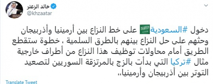 وقال في تغريدة عبر "تويتر" رصدها "المشهد العربي": "دخول السعودية على خط النزاع بين أرمينيا وأذربيجان وحثهم على حل النزاع بينهم بالطرق السلمية، خطوة ستقطع الطريق أمام محاولات توظيف هذا النزاع من أطراف خارجية مثال تركيا التي بدأت بالزج بالمرتزقة السوريين لتصعيد التوتر بين أذربيجان وأرمينيا".