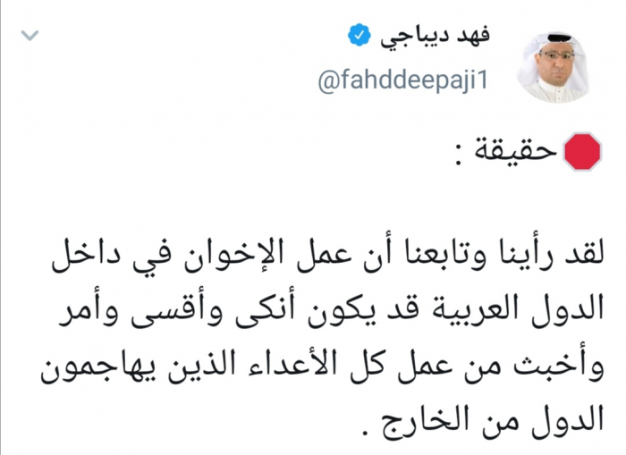 وغرد ديباجي عبر حسابه في تويتر ورصدها "المشهد العربي" قائلاً: "حقيقة لقد رأينا وتابعنا أن عمل الإخوان في داخل الدول العربية قد يكون أنكى وأقسى وأمر وأخبث من عمل كل الأعداء الذين يهاجمون الدول من الخارج".