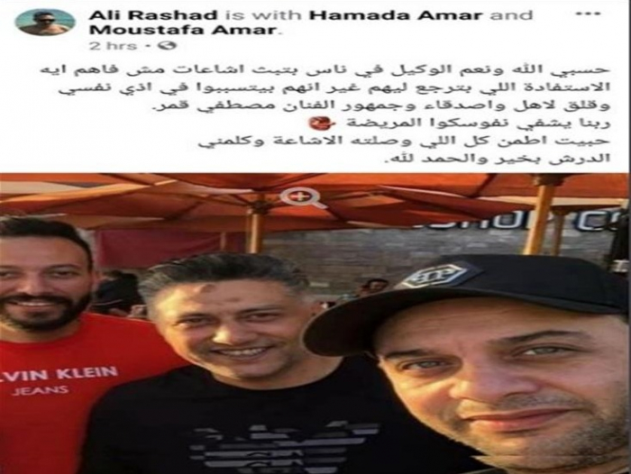 وكتب "علي" عبر حسابه على فيسبوك: "حسبي الله ونعم الوكيل .. في ناس بتبث شائعات مش فاهم إيه الاستفادة اللي بترجع ليهم، غير إنهم بيتسببوا في أذى نفسي وقلق لأهل وأصدقاء وجمهور الفنان مصطفى قمر، ربنا يشفي نفوسكم المريضة، حبيت أطمن كل اللي وصلته الشائعة وكلمني.. الدرش بخير والحمد لله".