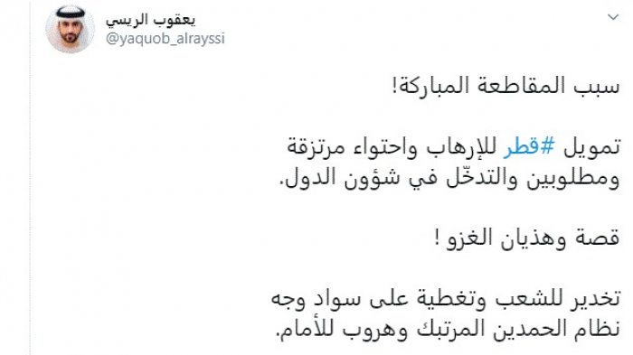 قال الكاتب الإماراتي يعقوب الريسي، اليوم، إن تمويل قطر للإرهاب هو السبب الرئيسي لمقاطعة دول الرباعي العربي لقطر.