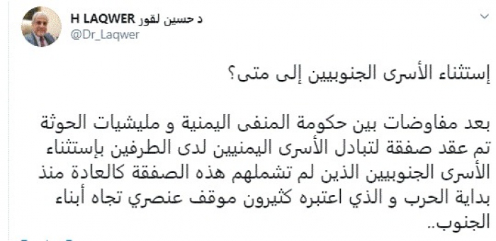 طرح المحلل السياسي الدكتور حسين لقور، اليوم، تساؤلاً بشأن استثناء الأسرى الجنوبيين من الصفقات التي تعقد بين حكومة الشرعية ومليشيات الحوثي الإرهابية للإفراج عن الأسرى.