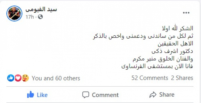 ونشر الفيومي صورة له من داخل المستشفى عبر حسابه بموقع التواصل الاجتماعي "فيسبوك"، وعلّق: "الشكر لله أولا ثم لكل من ساندني ودعمني وأخص بالذكر الأهل الحقيقيين، دكتور أشرف زكي.. بحبك في الله، والفنان الخلوق منير مكرم أنا بحبك، فأنا الآن بالمستشفى الفرنساوي".