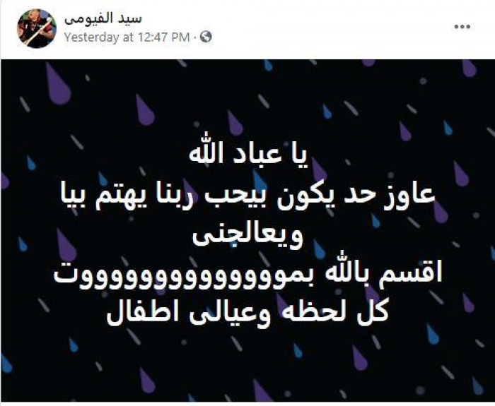 ويأتي ذلك بعدما وجه الفنان سيد الفيومي عدة استغاثت عبر حسابه بـ"فيسبوك"، الأحد، إذ كتب: "يا عباد الله.. عاوز حد يكون بيحب ربنا يهتم بيا ويعالجني.. أقسم بالله بموت كل لحظة وعيالي أطفال".