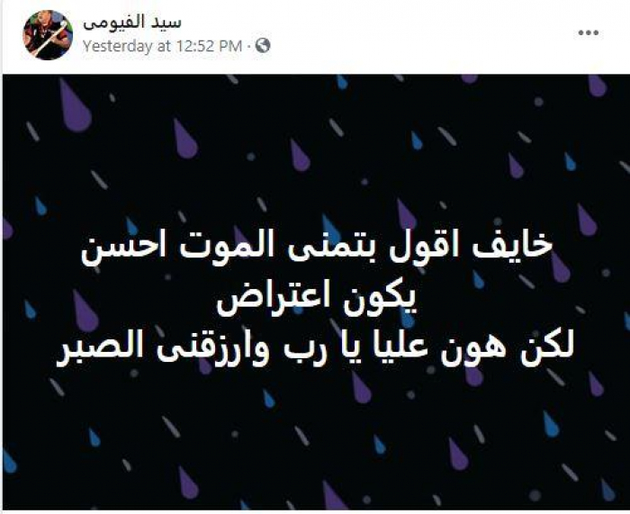 وفي منشور آخر كتب: "مليش غيرك يا رب، أكيد أنت الوحيد اللي عالم باللي بيّا ما دام خلقك قلبهم حجر.. خايف أقول بتمنى الموت أحسن يكون اعتراض.. لكن هوّن عليا يا رب وارزقني الصبر".