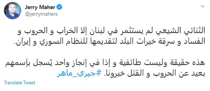 وكتب في تغريدة عبر "تويتر" رصدها "المشهد العربي": "الثنائي الشيعي لم يستثمر في لبنان إلا الخراب والحروب و الفساد وسرقة خيرات البلد لتقديمها للنظام السوري وإيران".