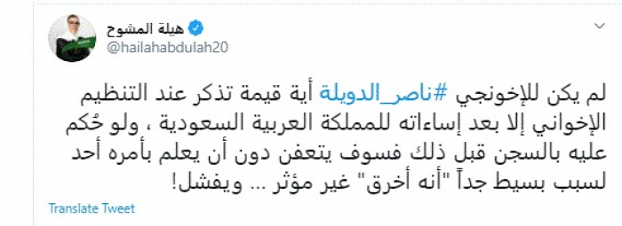 وقالت في تغريدة عبر "تويتر" رصدها "المشهد العربي": "لم يكن للإخونجي ناصر الدويلة أية قيمة تذكر عند التنظيم الإخواني إلا بعد إساءاته للمملكة العربية السعودية ، ولو حُكم عليه بالسجن قبل ذلك فسوف يتعفن دون أن يعلم بأمره أحد لسبب بسيط جداً ..... غير مؤثر … ويفشل".
