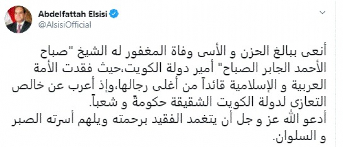 نعى الرئيس المصري عبد الفتاح السيسي، اليوم، أمير الكويت الشيخ صباح الأحمد الجابر الصباح.