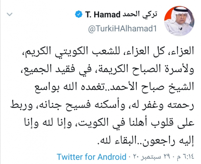 وقال الحمد في تغريدة له عبر حسابه بتويتر ورصدها "المشهد العربي": "العزاء، كل العزاء، للشعب الكويتي الكريم، ولأسرة الصباح الكريمة، في فقيد الجميع، الشيخ صباح الأحمد".