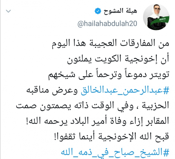 وقالت المشوح في تغريدة لها عبر حسابها بتويتر ورصدها "المشهد العربي": "من المفارقات العجيبة هذا اليوم أن إخونجية الكويت يملئون تويتر دموعاً وترحماً على شيخهم عبدالرحمن عبدالخالق وعرض مناقبه الحزبية".