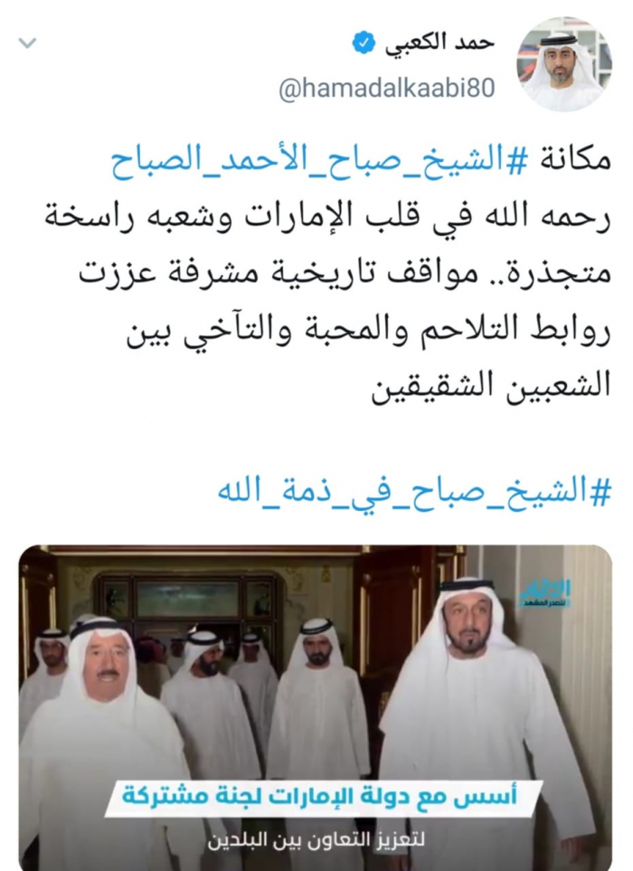 وقال الكعبي في تغريدة له عبر حسابه بتويتر ورصدها "المشهد العربي": "مكانة الشيخ صباح الأحمد الصباح رحمه الله في قلب الإمارات وشعبه راسخة متجذرة".