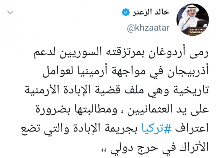 وقال الزعتر في تغريدة له عبر حسابه بتويتر ورصدها "المشهد العربي" إن رمى أردوغان بمرتزقته السوريين لدعم أذربيجان في مواجهة أرمينيا لعوامل تاريخية وهي ملف قضية الإبادة الأرمنية على يد العثمانيين، ومطالبتها بضرورة اعتراف تركيا بجريمة الإبادة والتي تضع الأتراك في حرج دولي".