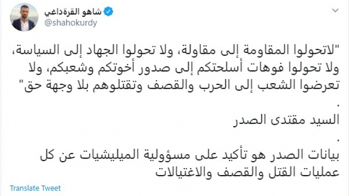 وقال في تغريدة عبر "تويتر" رصدها "المشهد العربي": "لاتحولوا المقاومة إلى مقاولة، ولا تحولوا الجهاد إلى السياسة، ولا تحولوا فوهات أسلحتكم إلى صدور أخوتكم وشعبكم، ولا تعرضوا الشعب إلى الحرب والقصف وتقتلوهم بلا وجهة حق. السيد مقتدى الصدر.. بيانات الصدر هو تأكيد على مسؤولية الميليشيات عن كل عمليات القتل والقصف والاغتيالات".