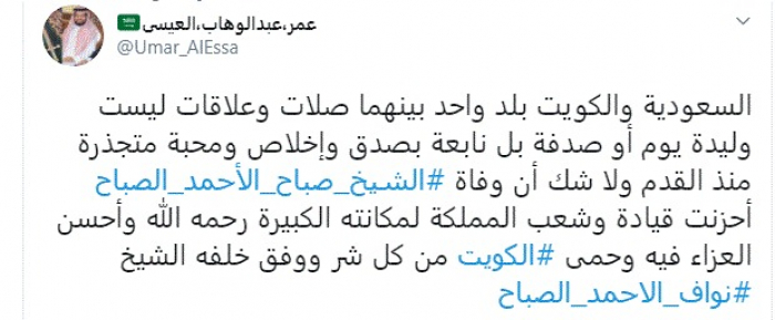 وكتب في تغريدة عبر "تويتر" رصدها "المشهد العربي": "السعودية والكويت بلد واحد بينهما صلات وعلاقات ليست وليدة يوم أو صدفة بل نابعة بصدق وإخلاص ومحبة متجذرة منذ القدم".