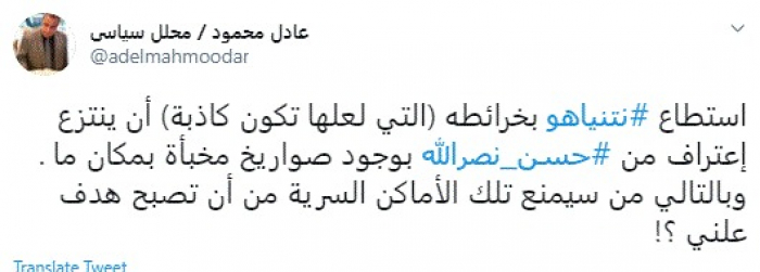 وكتب في تغريدة عبر "تويتر" رصدها "المشهد العربي": "استطاع نتنياهو بخرائطه (التي لعلها تكون كاذبة) أن ينتزع اعتراف من حسن نصرالله بوجود صواريخ مخبأة بمكان ما".