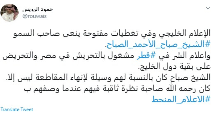 وقال في تغريدة عبر "تويتر" رصدها "المشهد العربي": "الإعلام الخليجي وفي تغطيات مفتوحة ينعى صاحب السمو الشيخ صباح الأحمد الصباح وإعلام الشر في قطر مشغول بالتحريش في مصر والتحريض على بقية دول الخليج".