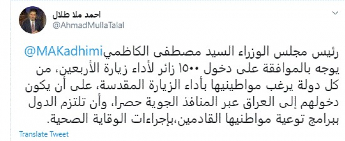 وقال في تغريدة عبر "تويتر" رصدها "المشهد العربي": "رئيس مجلس الوزراء السيد مصطفى الكاظمي يوجه بالموافقة على دخول ١٥٠٠ زائر لأداء زيارة الأربعين، من كل دولة يرغب مواطنيها بأداء الزيارة المقدسة، على أن يكون دخولهم إلى العراق عبر المنافذ الجوية حصرا، وأن تلتزم الدول ببرامج توعية مواطنيها القادمين،بإجراءات الوقاية الصحية".