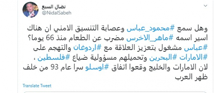 وقال في تغريدة عبر "تويتر" رصدها "المشهد العربي": "وهل سمع محمود عباس وعصابة التنسيق الأمني أن هناك أسير اسمه ماهر الأخرس مضرب عن الطعام منذ 66 يوما؟".