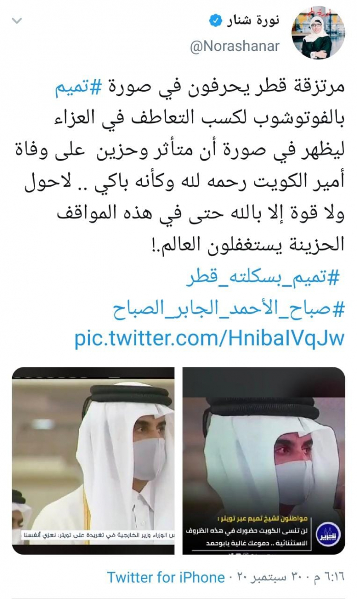 وكتبت شنار عبر تغريدة لها على "تويتر" رصدها " المشهد العربي": "مرتزقة قطر يحرفون في صورة تميم بالفوتوشوب لكسب التعاطف في العزاء، ليظهر في صورة أنه متأثر وحزين على وفاة أمير الكويت رحمه لله وكأنه باكي".