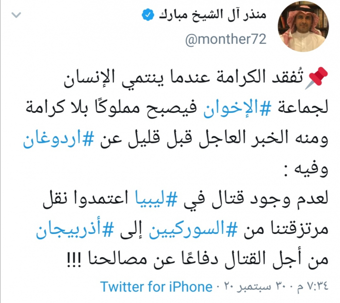 هاجم المدون السعودي منذر آل الشيخ مبارك، جماعة الإخوان الإرهابية ووصفها بأنها بلا كرامة بسبب الرئيس التركي رجب طيب أردوغان.
