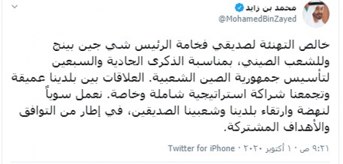 وكتب "بن زايد" تغريدة عبر حسابه الرسمي بتويتر، رصدها"المشهد العربي": "خالص التهنئة لصديقي فخامة الرئيس شي جین بینج وللشعب الصیني، بمناسبة الذكرى الحادیة والسبعین لتأسیس جمھوریة الصین الشعبیة".